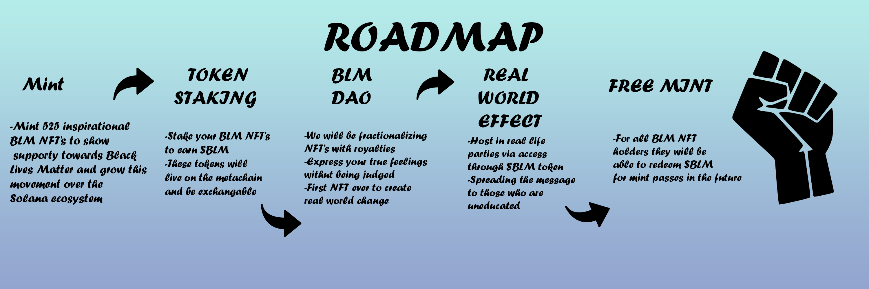 BLM NFT is the worlds first NFT to stand for a greater cause and something bigger than Solana itself. By bringing to light that there are still people out there that are striving to make the world a better place. We are here to gather like minded individuals to educate and promote Black Lives Matter in a safe and friendly environment. We are here to bring people together and acknowledge that the world we are in is not perfect, but together we can get closer everyday.